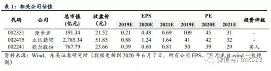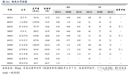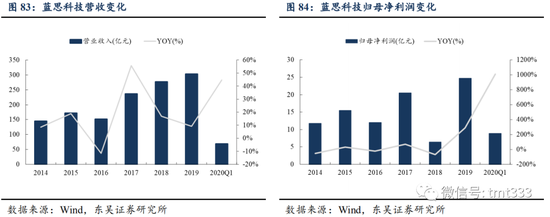 蓝思科技 2020Q1 毛利率 26.74%,同比上升 8.58 个百分点。净利率 12.78%,同比上升 14.90 个百分点。蓝思科技主营业务为消费电子、材料、车控电子制造等。蓝思科技于 2018 年以 9047 万元获取以电声业务为主的豪恩声学 15%的股份,TWS 耳机市场增长利好其声学产品业务,2019 年豪恩声学向蓝思科技贡献股利分红 290 万元。