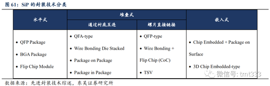 SiP 工艺涉及打线接合(Wire Bonding)、覆晶技术(Flip Chip)、 SMT 等技术以及专用设备,因而 SiP 对厂商 know-how 及资金能力要求较高,目前领先的半导体封测厂商和组装厂商可以提供 SiP 工艺。随着 TWS 的功能和外形升级,未来 SiP 工艺若向安卓 TWS 阵营渗透,领先的半导体封测厂商和组装厂商将会持续受益。