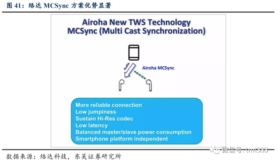 络达科技:推出MCSync方案,多款芯片已经量产。2019年初,络达推出第一代应用MCSync技术的AB1532芯片。此方案具有更稳定,支撑高解析音频码流,低延时、双耳耗电更平衡,各种手机平台均适用等优点。同时,MCSync技术支持Multiple speakers连接。