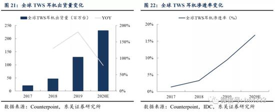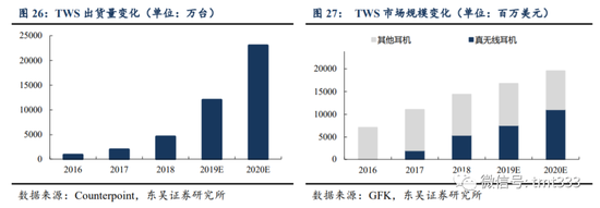 根据Counterpoint Research统计,2016年全球TWS耳机出货量918万副,预计2020年TWS耳机出货量将达到2.3亿副以上,2016-2020年TWS出货量CAGR达90%+。根据GFK测算,2020年TWS市场规模将超过110亿美元。(根据我们的调研预估,若加上白牌TWS,出货量和市场规模将更大)。