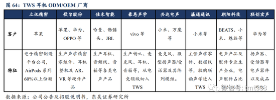 相较于传统耳机,TWS 耳机除了与有线耳机共通的发生单元外,增加了各类控制/传输芯片、传感器、存储器、降噪组件、天线等部件,还要保证佩戴舒适性严格控制体积、重量,这使得耳机的复杂程度、制造难度大幅提升。类似于 TWS 整机,我们将 TWS 的 ODM/OEM 厂商分为两类,一是传统的电声产品 ODM/OEM 厂,二是追随大客户横向拓展至 TWS 组装领域的精密制造平台型公司。国内 ODM/OEM 厂商有立讯精密、歌尔股份、台湾英业达、佳禾智能、朝阳科技、联创宏声、豪恩声学、共达电声等。其中,立讯精密、歌尔声学和台湾英业达属于电子精密制造平台公司,系苹果系供应商,歌尔还是华为等手机厂的供应商。传统的电声产品厂商中,佳禾智能为海外厂商主要供应商,瀛通通讯、共达电声、朝阳科技为小米、漫步者等品牌的供应商,豪恩声学主要为电竞游戏以及为一线 ODM 的二次外包公司,联创宏声为华为 in box 有线耳机的代工厂。