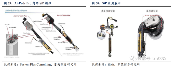 由于 TWS 耳机需要满足空间及重量的双重要求,而未来功能集成将倒逼零件微小化。以 Apple Watch 为例,仅在边长为 25-30 mm 的正方形范围内,集成了约 1000 颗左右的有源及无源器件。苹果从 AirPods Pro 开始导入 SiP 封装,主要由安靠(Amkor)、环旭电子(USI)供应,立讯精密等亦有布局。