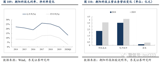 朝阳科技 2020Q1 毛利率 13.09%,同比下降 7.49 个百分点。净利率 2.79%,同比下 降 1.05 个百分点。朝阳科技主营业务为耳机和电声产品配件等。公司的耳机产品业务2019 年营收达到 3.6 亿元,同比增长 60.89%,其中 TWS 耳机营收上涨 1.36 亿元,成为公司的重要利润增长点。