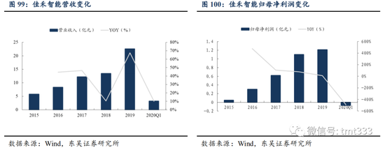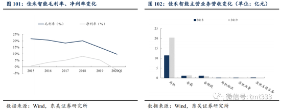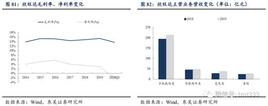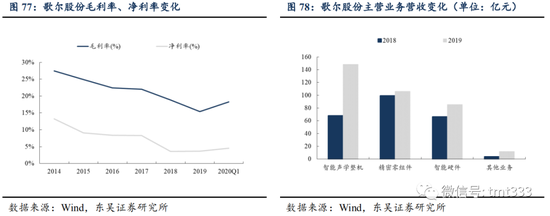 佳禾智能 2020Q1 毛利率 9.75%,同比下降 5.35 个百分点,净利率-2.32%,同比下降 2.98 个百分点。佳禾智能是一家从事专业电声产品的设计研发、制造、销售的国内领先电声产品制造商。公司主营业为分为:耳机、音箱、音频线、耳机部品、其他业务等。受 TWS 耳机市场份额大幅提升,2019 年耳机业务为公司贡献了 20.35 亿元的营业收入,同比提高 80.25%。