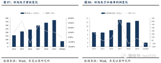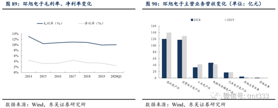 环旭电子 2020Q1 毛利率 10.06%,同比增长 0.16 个百分点。净利率 2.48%,同比下 降 0.43 个百分点。环旭电子主营业务为通讯类产品、消费电子类产品、工业类产品、电脑及储存类产品、汽车电子类产品等。环旭电子是封测巨头日月光的子公司,并且在高端封测‘SIP’领域拥有极强的竞争力,2019 年公司通讯类产品和消费电子类产品分别贡献了 37.42%及 34.57%的营收,是公司主要收入来源。