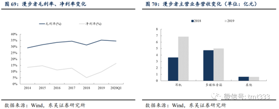 漫步者 2020Q1 毛利率 34.51%,同比增长 3.31 个百分点。净利率 16.61%,同比增长 4.11 个百分点。漫步者主营业务可分为耳机、多媒体音箱和其他,受 TWS 市场红利,漫步者耳机业务 2019 年贡献营收 6.84 亿元,同比增长 91.06%。