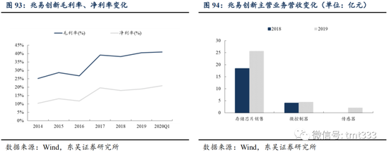 兆易创新 2020Q1 毛利率 40.92%,同比增长 2.44 个百分点。净利率 20.82%,同比增长 12.15个百分点。兆易创新主营业务为存储芯片销售、微控制器等。其存储芯片销售业务 2019 年营收 25.56 亿元,同比增长 38.99%,主要受益于 NOR Flash 在 TWS 耳机等可穿戴设备中的优势地位。