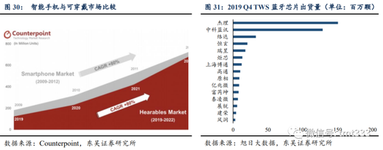 我们参考智能手机的发展历史,TWS行业竞争格局会从AirPods引领行业发展(类似iPhone 4引领智能手机变革),攻克蓝牙芯片双耳链接的核心痛点之后,低廉的白牌 TWS 耳机开始野蛮生长,TWS渗透率加速提升(类似智能手机起步初期山寨机盛行)。当下沙漏型市场具体表现为一方面AirPods出货量一直雄踞40%以上的品牌市场份额,而另一方面,根据旭日大数据统计,2019年四季度主打低廉的价格的珠海杰理TWS蓝牙芯片出货量一骑绝尘。因此我们认为当下沙漏市场格局中,引领行业的头部企业和主打性价比的产品将充分享受行业早期发展红利。