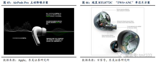 TWS耳机的降噪功能愈发受到消费者重视。近年来,主动降噪技术已成为高端耳机产品的标配。自苹果发布AirPods Pro后,行业产品加速向“TWS+ANC”方向转变。目前,市场上主流的主动降噪蓝牙耳机均采用蓝牙芯片与主动降噪芯片分立的方案,对于内部空间紧张的TWS耳机来说,单芯片方案可提供更多的空间给声学器件和电池模组,并拥有更低功耗的优势。除了主动降噪芯片,TWS耳机的降噪效果还与耳机腔体的设计有关,需要芯片厂与OEM/ODM厂商长期紧密合作,以达到良好的降噪体验。