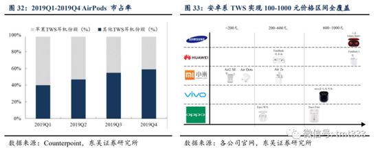 我们认为,随着产业链的发展,未来市场格局将逐步从沙漏型走向均衡。虽然目前苹果TWS耳机一枝独秀,但长远来看,安卓TWS耳机前景也十分乐观。手机厂商与无线耳机形成高生态契合度,这是手机厂商进军TWS产业的共同优势。全球9.25亿部iPhone的保有量是AirPods系列产品成功的重要原因,而全球出货量是苹果六倍的安卓手机,也将充分发挥装机量优势。相比苹果TWS耳机的高端定位,安卓系产品具备完备的产品价格体系,实现了100-1000元价格区间的全覆盖。在主打性价比的市场中,小米耳机独占龙头;高端市场中,华为、三星部分产品也能与苹果的性能对标。苹果的市场份额开始从高位回落,市占率从2019年一季度的60%下降至2019年第四季度的41%。