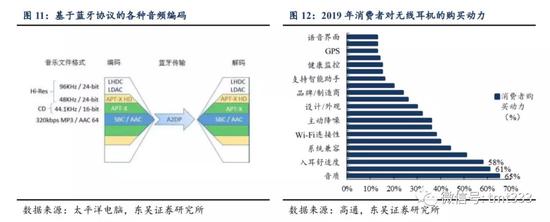 根据高通《2019全球音频消费者调研报告》数据显示,对消费者而言,清晰的音质至关重要,它已连续四年成为消费者在选择音频设备时最期待的特性。65%的全球消费者表示音质是他们的主要购买动力,63%的耳机购买者表示高分辨率音质十分重要。早期 TWS 耳机的音质普遍较差,与有线耳机相距甚远,主要系蓝牙传输音频主要依赖于A2DP协议,该对传输的数据量进行了限制,因此各家厂商在基于蓝牙的基础上开发新的音频编码传输方式以达到更好的音质效果。目前蓝牙音频编码传输方式主要有SBC、AAC、APTX、LDAC、LHDC等。