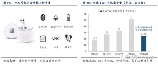 根据Counterpoint的预测,2020年TWS耳机的出货量有望达2.3亿台,同比增速达78.29%。参考2019年智能手机的市场容量(13.71亿台),TWS耳机的渗透率提升空间仍十分广阔。