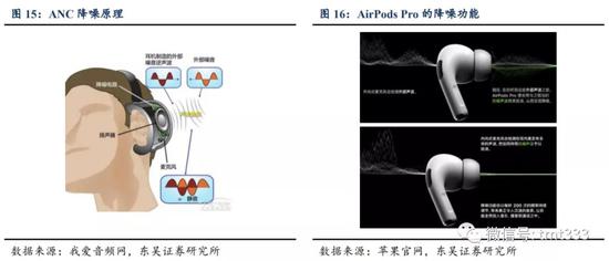 AirPods Pro 最大更新便是增加了主动降噪功能。ANC降噪(Active Noise Control主动降噪)的工作原理是麦克风收集外部的环境噪音,然后系统变换为一个反相的声波加到喇叭端,最终人耳听到的声音是:环境噪音+反相的环境噪音,两种噪音叠加从而实现感官上的噪音降低。以AirPods Pro为例,其搭载了三颗麦克风:外向式麦克风(波束成形麦克风),内向式麦克风和通话麦克风(波束成形麦克风)。其降噪原理和传统头戴主动降噪耳机原理并无二致,外向式麦克风就是所谓的前馈麦克风,负责收集环境噪音,内向式麦克风就是所谓的反馈麦克风,通过检测收听实施优化。两者与高集成度,高性能的H1封装系统配合实时检测输出,极致的降噪效果就此实现。