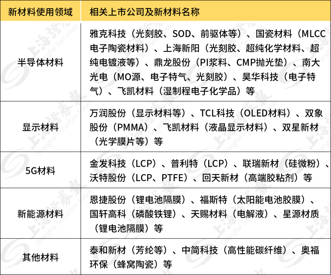 简单梳理涉及半导体、显示器、5G、新能源及其他领域化工新材料的部分上市公司可以发现,除了高科技企业,一些传统的化工企业也通过创新开发,转型升级为化工新材料的生产企业。