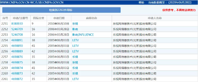 值得一提的是,乐视网所注册过的商标远不止1300项,商标局系统显示,乐视名下申请过2261件商标。再加上乐视申请的大批专利,或许未来乐视还会出售这些资产。