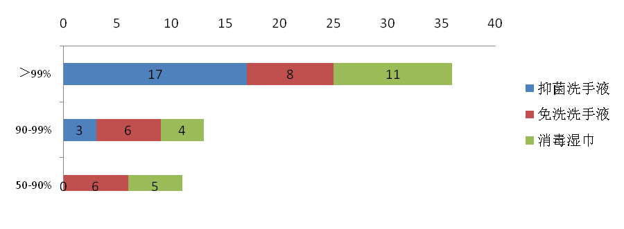 杀菌性能上,60件样品均能杀灭规定的菌落数量,但杀菌速度差异明显,其中12件样品(9件消毒湿巾,3件抑菌洗手液)杀菌最快,能在5秒内迅速杀菌,15件样品和26件样品分别在1分钟和3分钟以内杀菌,7件免洗洗手液样品杀菌略慢,用时超过了3分钟。