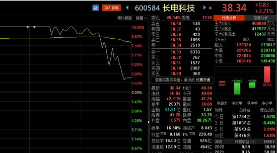 同时也带动一批A股芯片股尾盘跳水。长电科技午后打开涨停,截至收盘,涨幅收缩至2.2%。全天成交额超80亿元,换手率达16.8%。而其半个月内涨幅一度超40%。