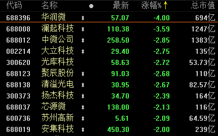 华润微日内换手率超20%,振幅达11.5%,总成交额近30亿;中微公司盘中最高股价逼近300元,尾盘跳水,收于258.5元,振幅近15%;安集科技盘中创新高,股价突破500元,但收盘价跌至450.3元,振幅达13%。