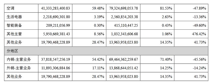 从营业收入构成来看,上半年,比重最大的空调产品营业收入413.33亿元,占比大幅下降47.89%;生活电器实现营收22.19亿元,占总营收3.19%,同比下滑-13.36%;智能装备实现营收2.09亿元,占总营收0.30%,同比下滑49.60%;其他业务实现营收197.9亿元,占总营收14.35%,同比增长41.73%,其他主营实现营收59.5亿元,占总营收8.56%,同比增长476.42%。