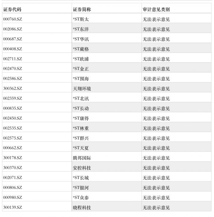 根据wind数据显示,2019年年报中有20家公司去年财务会计报告被出具“无法表示意见”,尚没有企业被出具“否定意见”;近一年来,近一年以来,公开被证监会立案调查的企业合计54家;深市存在退市风险的ST或*ST股则分别有117家。