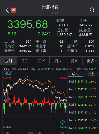 上证指数从早上大涨超1%,到收跌0.24%,3400点再次得而复失。