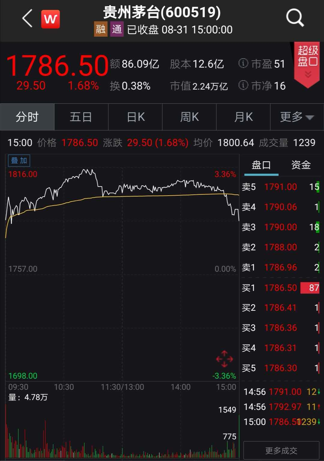 茅台尾盘涨幅收窄,没能收于1800元之上。