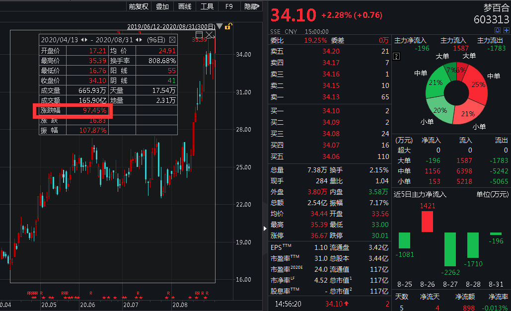 而从股价来看,梦百合也是近期大牛股,今天盘中一度新高,收涨2.28%,市值超117亿元。而把时间拉长,梦百合的股价从4月中以来几近翻倍。