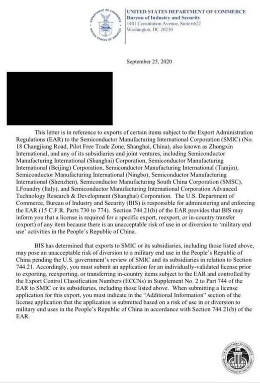 今天网上流传、并得到路透社确认的那封美国商务部对中芯国际施加出口限制的信不过,中芯国际会遭到美国政府的这一打压并不令舆论意外。早在9月初,美国五角大楼就已经预告过此事,称美方正在考虑把中芯国际拉入美国的出口黑名单,理由是该公司的民用芯片存在被用于军事的风险。