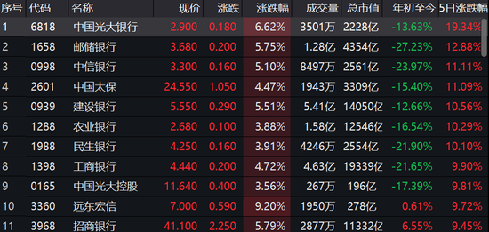 热点栏目银行股涨势凌厉,光大银行涨超6.6%,5日涨幅近20%,邮储银行涨近6%,中信银行、建行涨超5%,工行也涨了近5%,招行涨5.79%,民行、农业银行涨近4%。近5日,主要银行股涨幅都在10%左右。