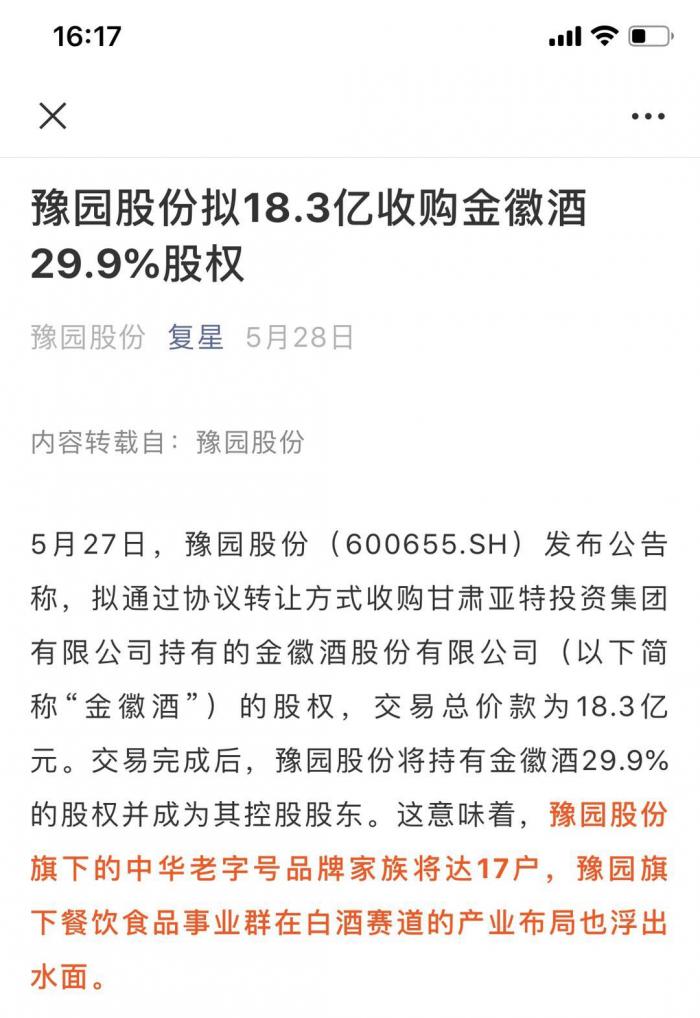 值得一提的是,在入主金徽酒之初,豫园股份曾在复星公众号上发表了一篇名为《豫园股份拟18.3亿收购金徽酒29.9%股权》的文章,直言“这意味着,豫园股份旗下的中华老字号品牌家族将达17户,豫园旗下餐饮食品事业群在白酒赛道的产业布局也浮出水面。”