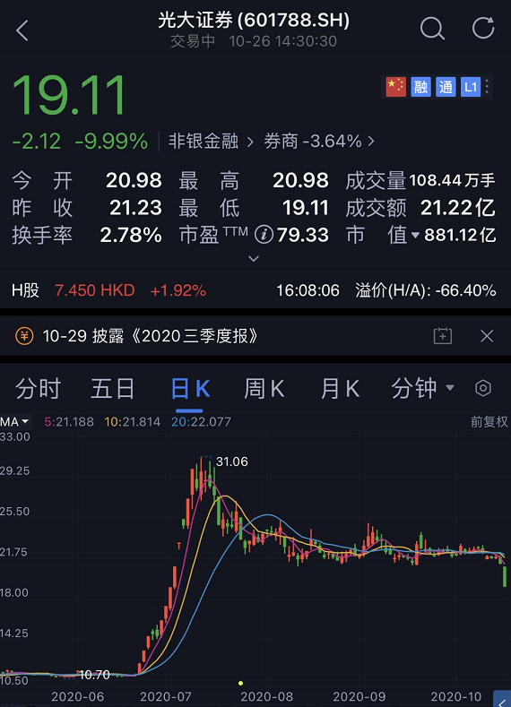 今天的股市行情,整体来看,不太乐观,尤其是牛市旗手券商股,集体大跌,尤其是曾经一个月大涨200%的光大证券,直接跌停。