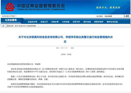 “其中,在增持至10%股权的那笔交易中,我们超出了约18万股,为此,我们11月2日已经收到北京证监局出具警示函行政监管措施。”王莉菲告诉记者。