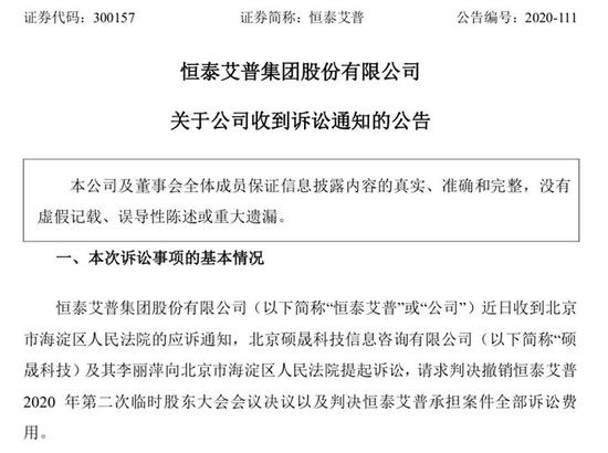 最近两天,恒泰艾普先后发出了多份公告。在公司董事会否掉北京硕晟科技信息有限公司(下称“硕晟科技”)及一致行动人提请召开股东大会的提议后,硕晟科技方面随即针对持股表决权纠纷向法院状告上市公司。