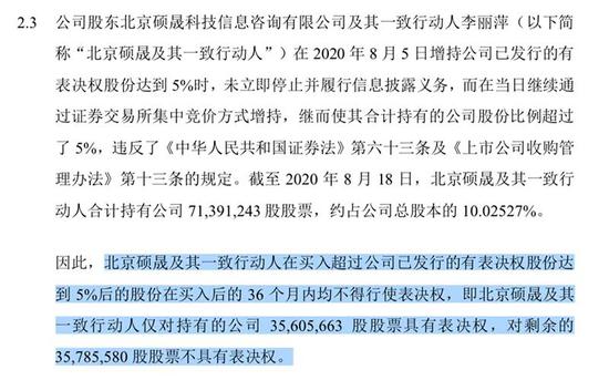 而硕晟科技一方则认为其持股到达5%后已及时披露,即便有违规瑕疵,根据北京证监局认定,也是在增持至10%节点略有“超线”,且若要按违规处理,不具备表决权的也应是当时购买“超线”的18万股。