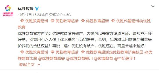 值得注意的是,10月17日,优胜教育官方声明,优胜教育没有破产,请那些不怀好意,别有用心之人停止不雅的行为和语言,会用法律武器维护自己合法权益。