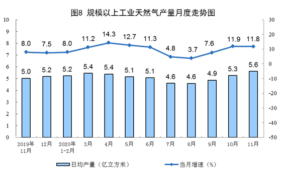 天然气继续保持较快增长。11月份,生产天然气169亿立方米,同比增长11.8%,增速比上月回落0.1个百分点;日产5.6亿立方米,环比增加0.3亿立方米。1—11月份,生产天然气1702亿立方米,同比增长9.3%。