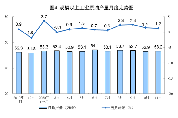 原油生产增速略有回落。11月份,生产原油1596万吨,同比增长1.2%,增速比上月回落0.2个百分点;日产53.2万吨,环比增加0.3万吨。加工原油5835万吨,增长3.2%,比上月加快0.6个百分点。1—11月份,生产原油1.8亿吨,同比增长1.6%;加工原油6.1亿吨,增长3.1%。