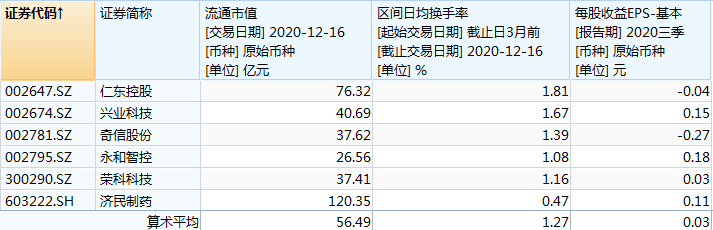 这6只股票过去3个月的日均换手率平均为1.27%,其中济民制药仅为0.47%。作为对比,全部A股过去3个月的日均换手率平均为2.73%。