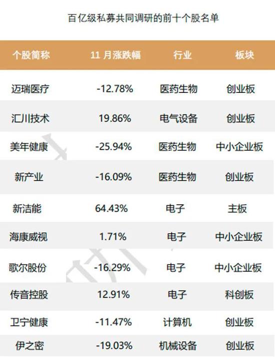 以11月百亿级私募组团调研股为例,电子、医药股为数最多,但除了次新股新洁能表现出彩外,其余个股大多表现不佳。即便如此,百亿私募的兴趣并未缩减。