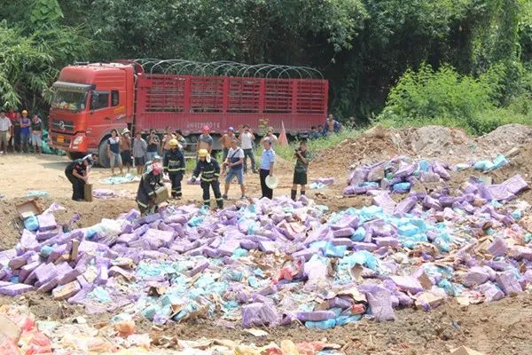 2015年7月8日,消防官兵和工作人员在中越边境云南河口集中销毁走私“僵尸肉” 670余吨。图"新华社