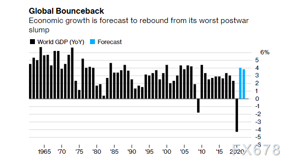 下图为1965年以来世界GDP变化比例,预计经济增长将从战后最严重的衰退中反弹。黑色柱状图表示往年GDP变化比例,蓝色柱状图为世界银行对于2021年增长的预期,预测2021年美国经济增长预期从6月份的4%下调至3.5%。
