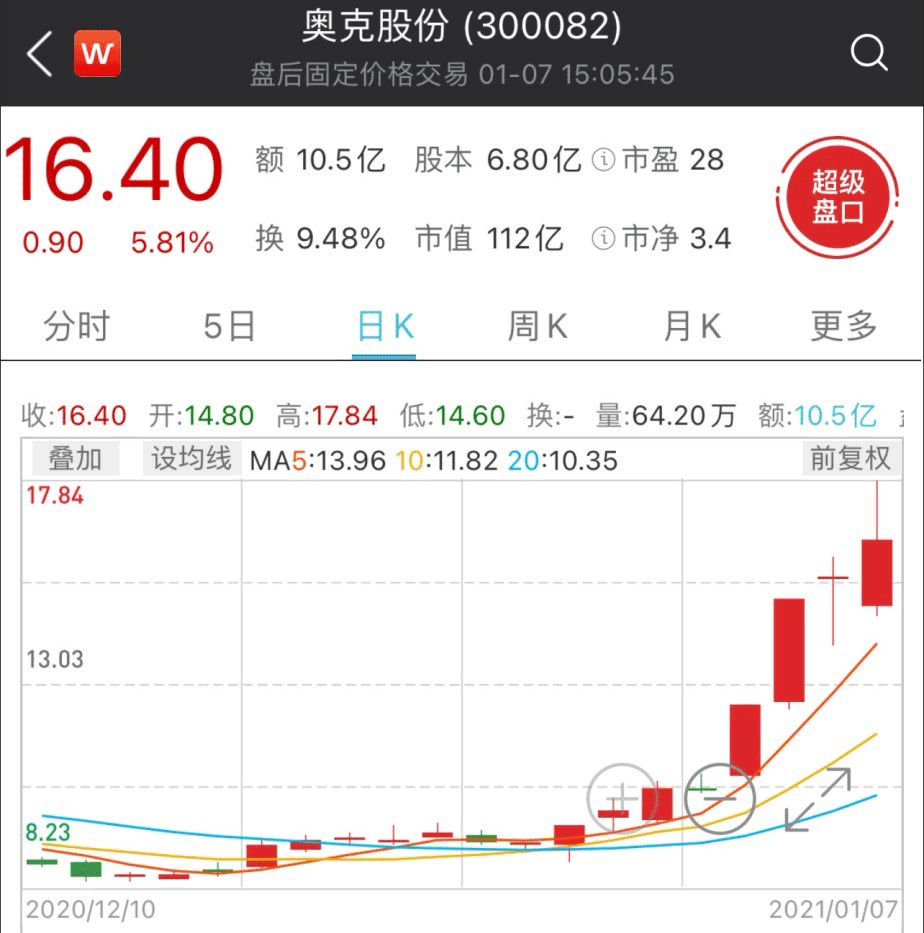 1月7日,奥克股份继续大涨,截至收盘时涨幅近6%。新年的四个交易日,公司股价已累计上涨近60%。再往前回溯一周,公司股价还在9元左右,最近10个交易日,股价已接近翻倍。