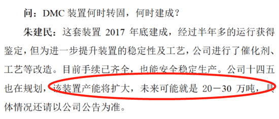 就在招商证券研报发布前的2020年12月29日,公司在互动易平台回复投资者提问称,公司工业级和电池级DMC的产能合计为2万吨/年,DMC生产装置整体运行正常、稳定。