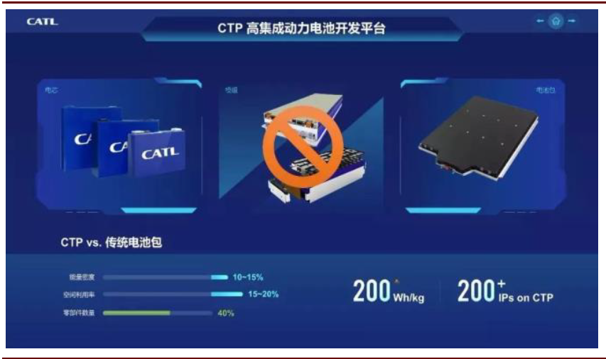 ►宁德时代:宁德时代在电芯层面沿用现有的方形产品,在模组层面减少模组、降低中间结构件耗材,CTP电池包体积利用率提高了20%,零部件数量减少40%,能量密度超过180Wh/kg,首款搭载该电池的为北汽EU5。