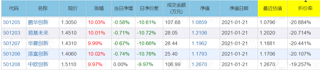 集思录数据显示,鹏华创新未来场内溢价率最高,达到20.884%;其次是易方达创新未来和华夏创新未来,溢价率分别达到20.714%和20.441%;汇添富创新未来和中欧创新未来的则为20.107%和19.257%。
