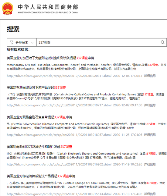 据商务部网站信息显示,近两年美国企业对我国企业发起337调查申请的次数较为频繁。