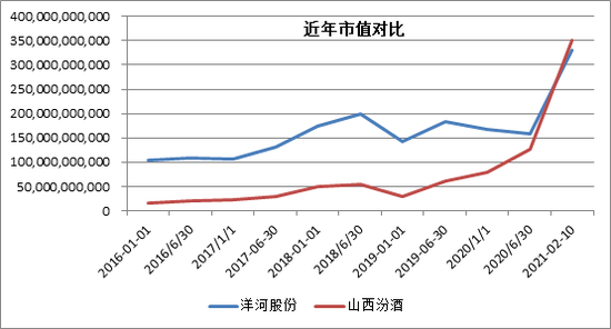 相比之下,泸州老窖和山西汾酒的业绩和市值均走出了几倍的走势,一增一降之间,山西汾酒最对了什么?值得我们探讨。