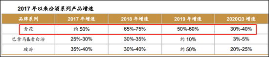 近年来山西汾酒在提升产品结构的策略下,青花汾系列产品连续取得了快速增长,大幅超出公司的总体营收。2020年前三季度青花同比30%+、玻汾同比20%+,同时,积极布局青花30·复兴版,青花汾近几年增速明显,占公司营收比重已达到28%。