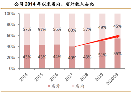 华润扩充了山西汾酒的渠道,不仅增加了下游款项的占用,还把公司的产品铺向了全国,2020年前三季度省外占比已达到55%,山西汾酒在华润的加持下,正在逐渐摆脱走不出山西的尴尬。