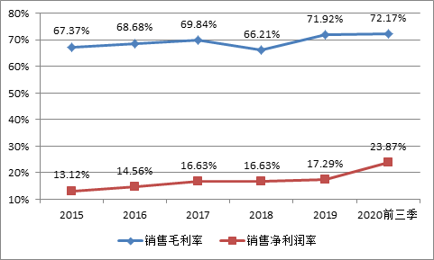 而另外两部分则出现明显的变化,首先看利润率水平,山西汾酒的毛利率水平从2015年的67.37%提升至2020年前三季度的72.17%,提升了近5个百分点。由于白酒公司的费用相对变化不大,因此毛利率的提升将使净利润率得到更大幅度的提升。汾酒的净利润率从2015年的13.12%升至2020前三季度的23.87%,涨幅为10.75个百分点之多。